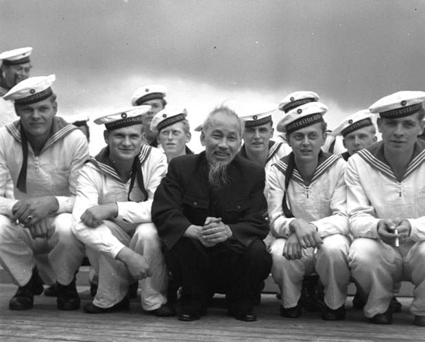 Bác Hồ chụp ảnh cùng các thủy thủ Cộng hoà Dân chủ Đức trên biển Baltic khi Bác đến thăm Cộng hoà Dân chủ Đức năm 1957. (Nguồn: Tấm gương (Đức)