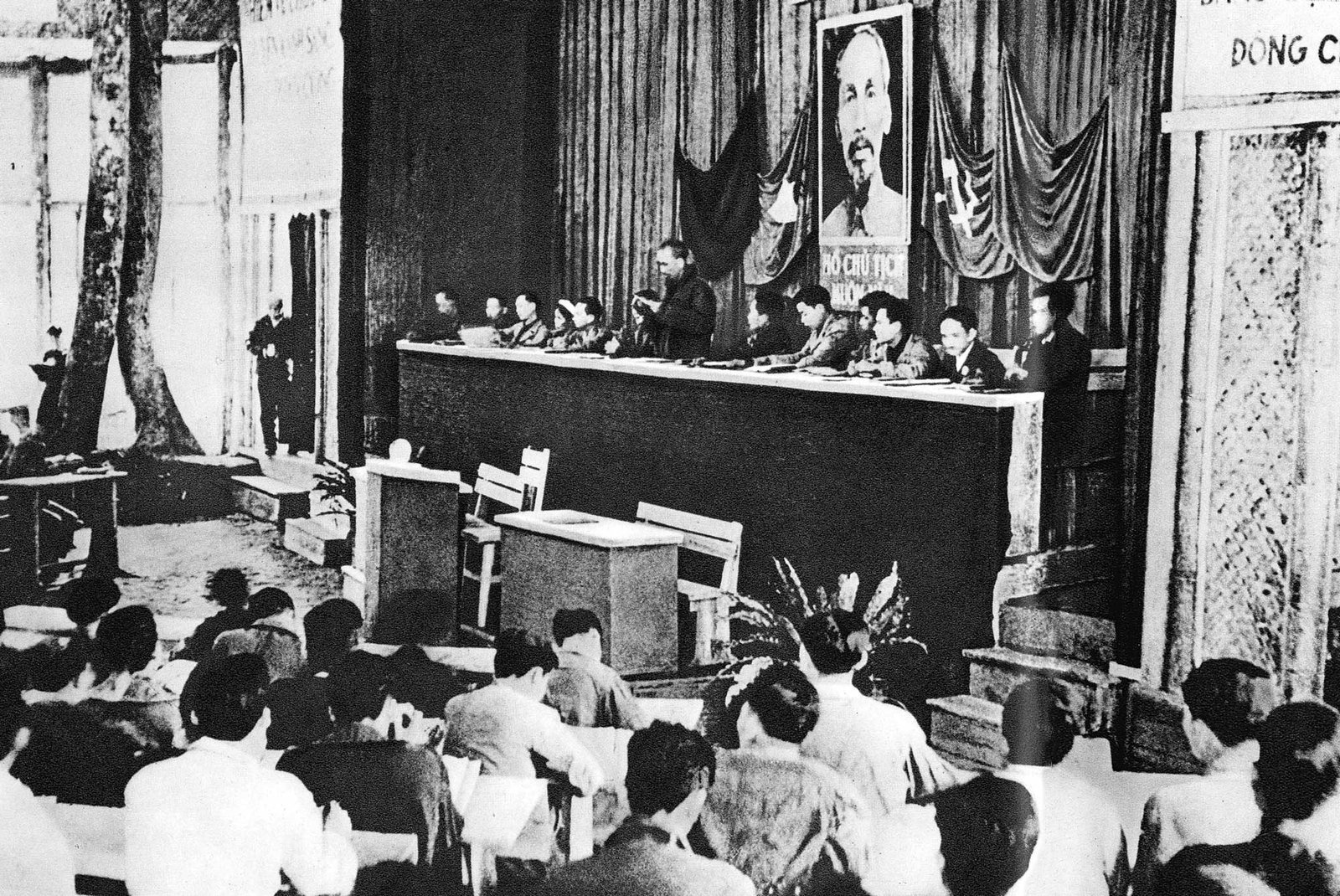 Chủ tịch Hồ Chí Minh đọc Báo cáo chính trị tại Đại hội đại biểu toàn quốc lần thứ II của Đảng tổ chức tại xã Vinh Quang, huyện Chiêm Hóa, tỉnh Tuyên Quang, tháng 2-1951. Ảnh: Tư liệu TTXVN