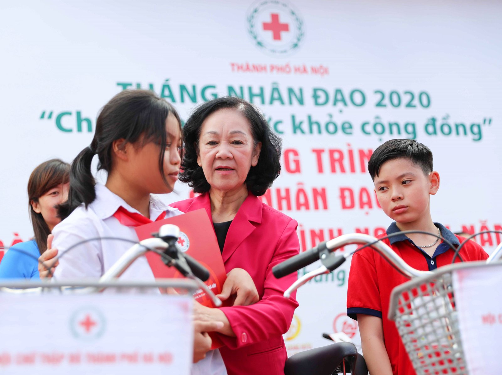 Ủy viên Bộ Chính trị, Trưởng Ban Dân vận Trung ương Trương Thị Mai trao xe đạp và học bổng cho các em học sinh, sinh viên có hoàn cảnh khó khăn vươn lên trong học tập. Ảnh: TTXVN