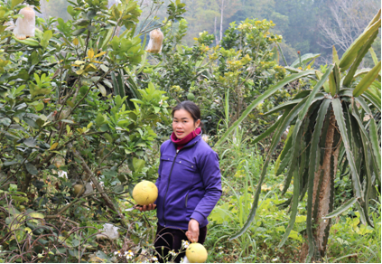Trong phát triển kinh tế, gia đình chị Bình mạnh dạn chuyển đổi cơ cấu cây trồng từ trồng lúa sang trồng cây thanh long và cây đào cảnh, đồng thời tận dụng diện tích ruộng khe làm ao cá kết hợp nuôi lợn và gia cầm; đầu tư máy móc tự san gạt đất đồi để trồng các loại cây ăn quả với diện tích 4 ha. Đến nay, gia đình chị có trên 2.300 cây ăn quả, 35 con lợn, 300 con gà siêu trứng và 100 con vịt, mang lại tổng thu nhập ổn định trên 200 triệu đồng/năm.