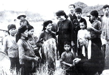 Bác Hồ thăm nông dân đang gặt lúa trên cánh đồng xã Hùng Sơn,