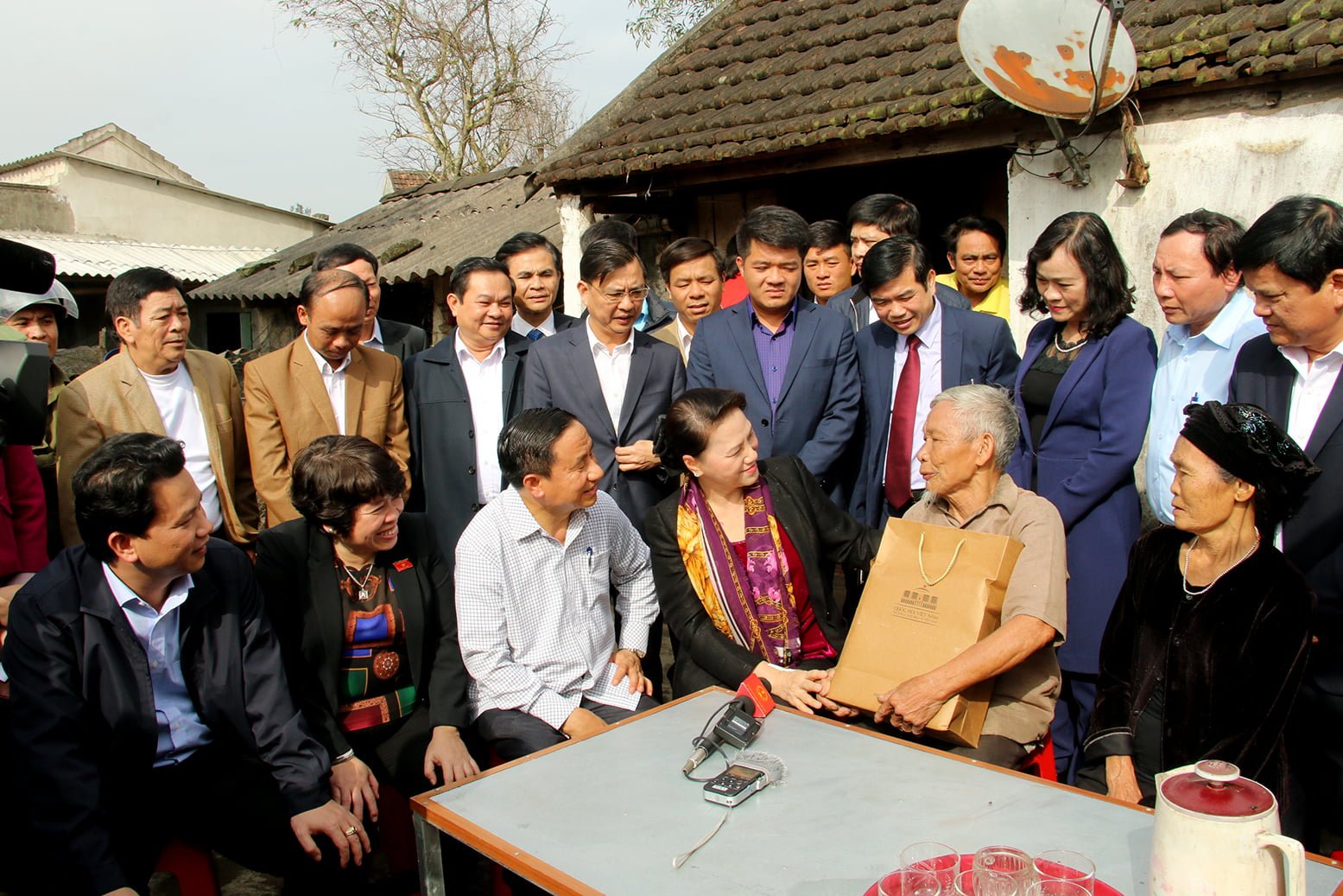 Ủy viên Bộ Chính trị, Chủ tịch Quốc hội Nguyễn Thị Kim Ngân đến thăm, tặng quà một số gia đình chính sách, hộ nghèo và nói chuyện với cán bộ, nhân dân thôn Thượng Hải, xã Thạch Hải (tỉnh Hà Tĩnh). Ảnh: Tư liệu