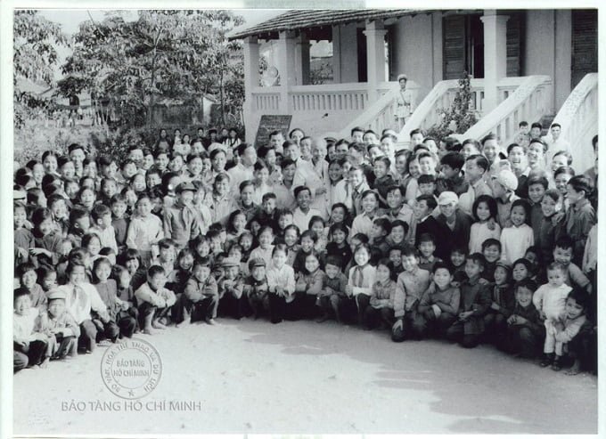 Chủ tịch Hồ Chí Minh chụp ảnh cùng giáo viên và các em học sinh Trường Cấp I, II Móng Cái, ngày 19-2-1960 (nguồn: Bảo tàng Hồ Chí Minh).