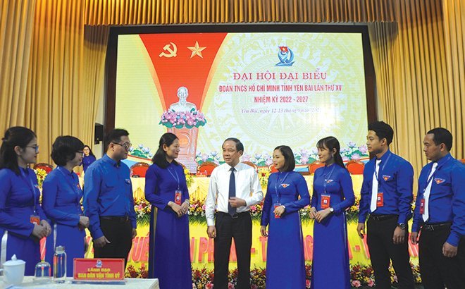 Đồng chí Tạ Văn Long – Phó Bí thư Thường trực Tỉnh ủy, Chủ tịch HĐND tỉnh trao đổi về công tác bồi dưỡng lý tưởng cách mạng cho thế hệ trẻ với các địa biểu dự Đại hội đại biểu Đoàn TNCS Hồ Chí Minh tỉnh Yên Bái lần thứ XV, nhiệm kỳ 2022 – 2027.