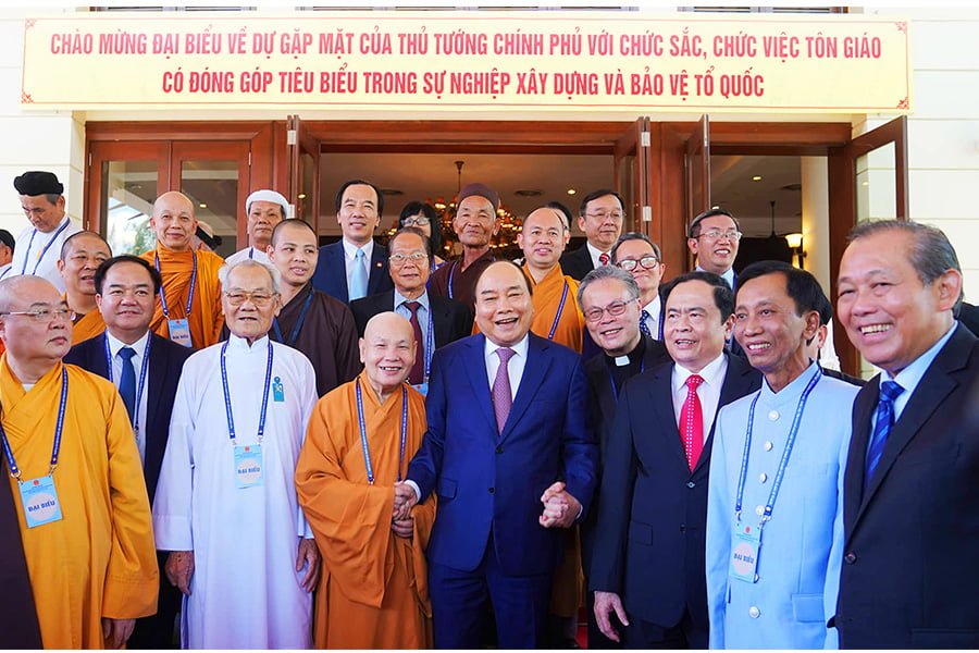 Ủy viên Bộ Chính trị, Thủ tướng Chính phủ Nguyễn Xuân Phúc (nay là Chủ tịch nước) gặp mặt, biểu dương các vị chức sắc tiêu biểu, lãnh đạo các tổ chức tôn giáo, khẳng định sự quan tâm, tôn trọng của Đảng, Nhà nước ta đối với quyền tự do tín ngưỡng, tôn giáo của nhân dân. Ảnh: vnanet.vn