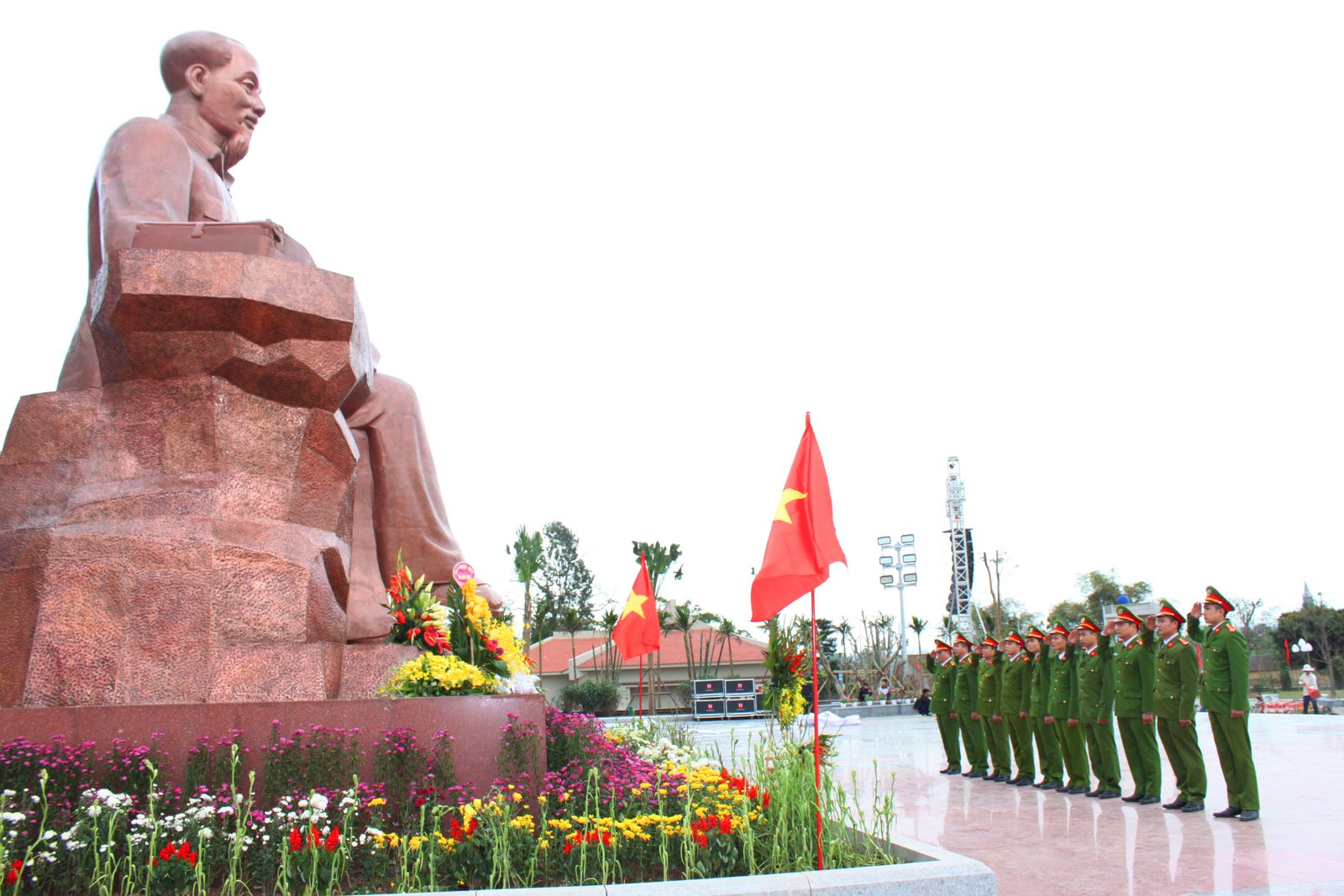 Cán bộ, chiến sĩ Đồn Công an Nhã Nam, huyện Tân Yên, tỉnh Bắc Giang bên tượng đài Bác Hồ tại Khu di tích lịch sử lưu niệm sáu điều Bác Hồ dạy Công an nhân dân. (Ảnh: congan.com.vn)