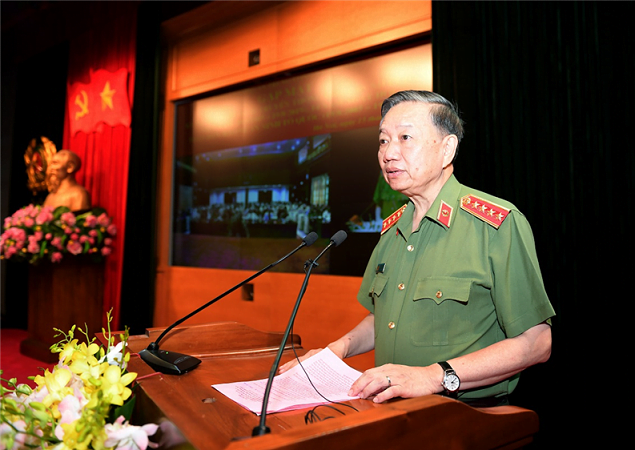 Bộ trưởng Tô Lâm phát biểu tại buổi gặp mặt truyền thống các thế hệ cán bộ lãnh đạo cao cấp, đoàn viên, thanh niên ưu tú trong CAND nhân kỷ niệm 74 năm Ngày truyền thống CAND Việt Nam (19/8/1945 – 19/8/2019) và 14 năm Ngày hội Toàn dân bảo vệ an ninh Tổ quốc (2005 – 2019). (Nguồn: Theo Cổng thông tin điện tử Bộ Công an)