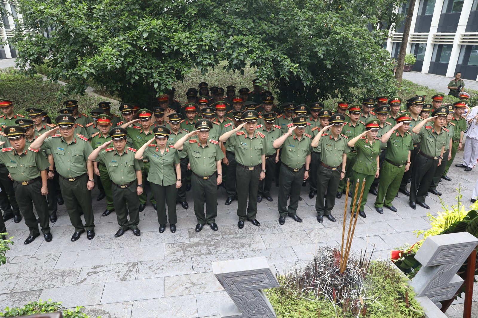 Đại tướng Tô Lâm, Ủy viên Bộ Chính trị, Bí thư Đảng ủy Công an Trung ương, Bộ trưởng Bộ Công an cùng các đại biểu dâng hoa, dâng hương tưởng niệm Chủ tịch Hồ Chí Minh tại Nhà tưởng niệm trong khuôn viên trụ sở Bộ Công an nhân dịp kỷ niệm 130 năm Ngày sinh Chủ tịch Hồ Chí Minh. Ảnh: TTXVN