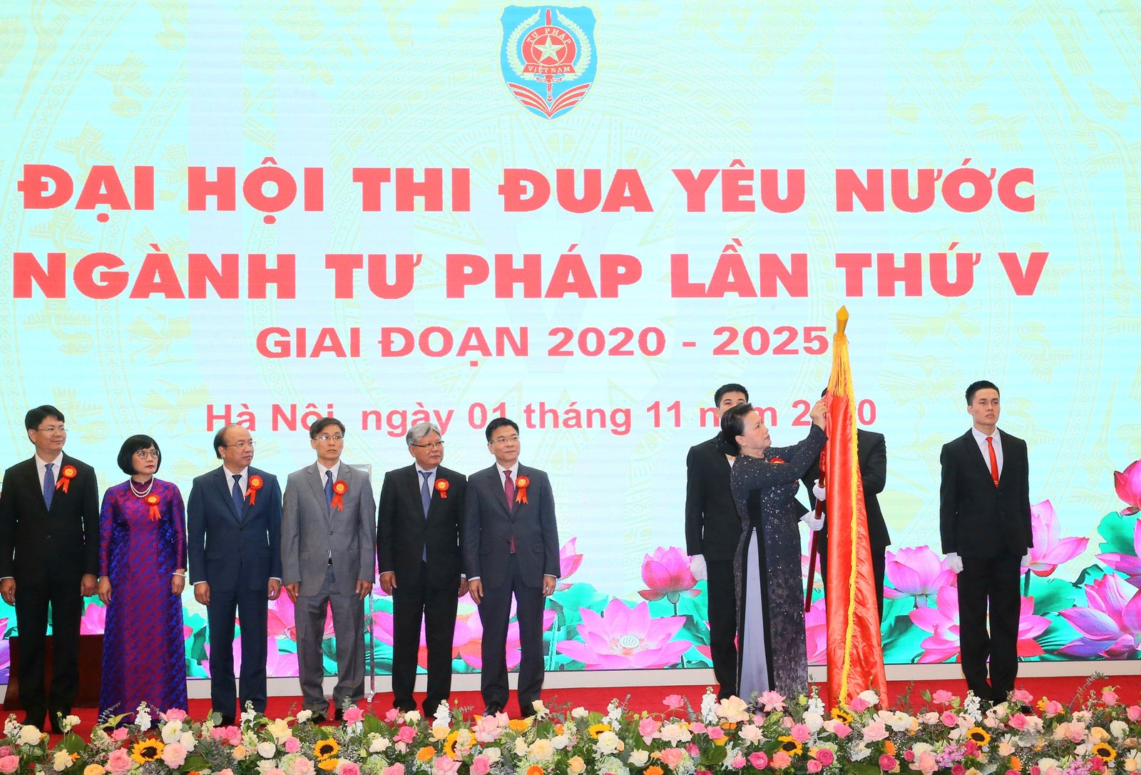 Ủy viên Bộ Chính trị, Chủ tịch Quốc hội Nguyễn Thị Kim Ngân trao Huân chương Lao động hạng Nhất của Chủ tịch nước tặng Bộ Tư pháp tại Đại hội Thi đua yêu nước ngành tư pháp lần thứ V. Ảnh: TTXVN